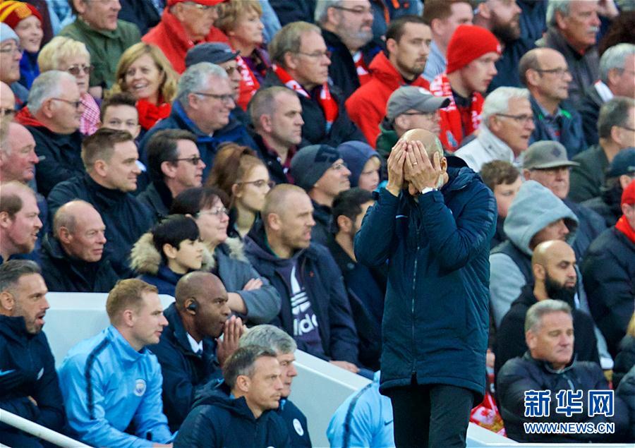 ↑10月7日,曼城队主帅瓜迪奥拉在比赛中神情懊恼。当日,在2018/2019赛季英格兰足球超级联赛第8轮的一场比赛中,利物浦队主场以0比0战平曼城队。 新华社发