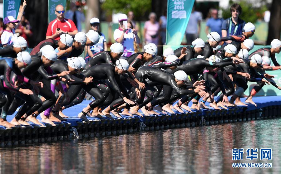 10月7日,参赛选手在比赛起点入水。 当日,在阿根廷布宜诺斯艾利斯举行的第三届夏季青年奥林匹克运动会女子铁人三项决赛中,南非选手施莱布施以58分45秒的成绩夺冠。 新华社记者李俊东摄