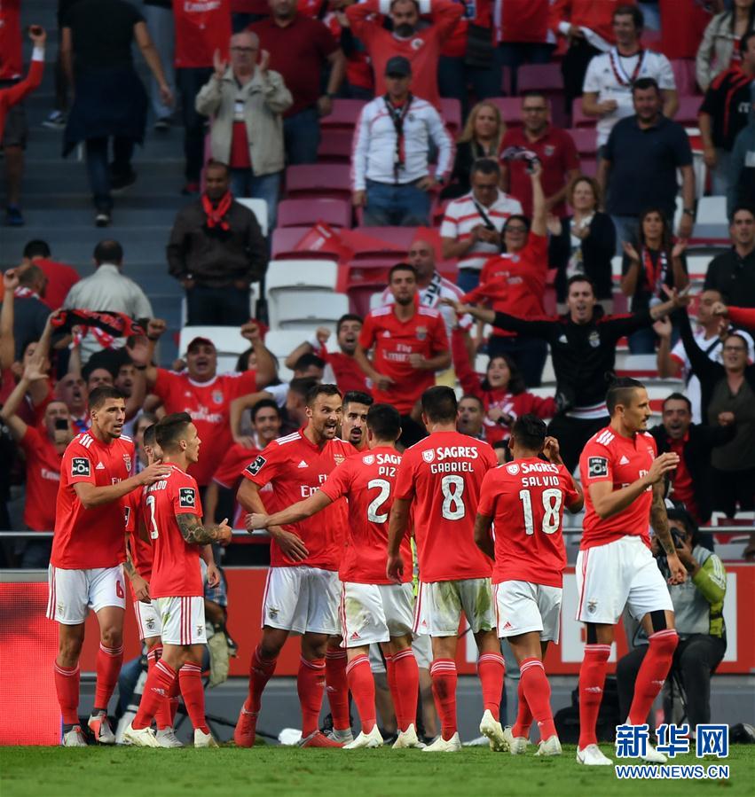 10月7日,本菲卡队球员庆祝进球。 当日,在葡萄牙首都里斯本光明球场举行的2018/2019赛季葡萄牙足球超级联赛第7轮比赛中,本菲卡队主场以1比0战胜波尔图队。 新华社记者张立云摄