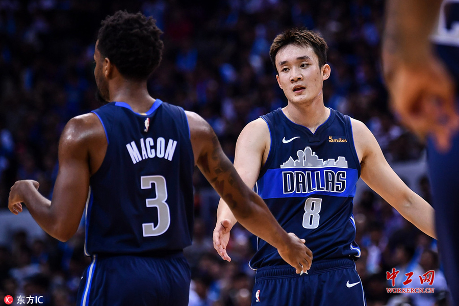2018年10月8日,上海,2018年NBA中国赛深圳站,独行侠VS76人。丁彦雨航与梅肯击掌