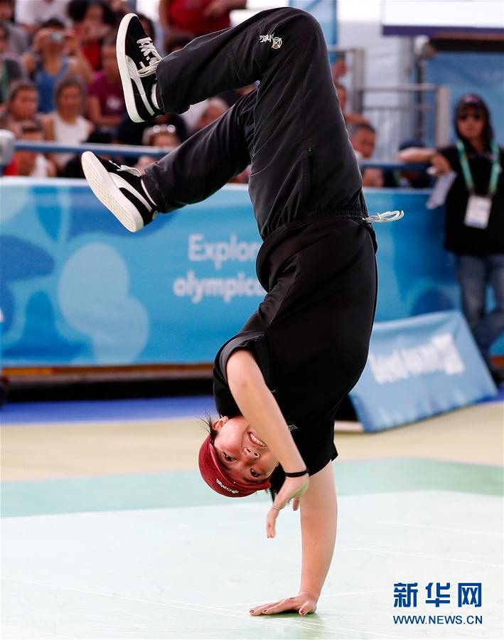 ↑10月8日,日本选手Ram在比赛中。 当日,在阿根廷布宜诺斯艾利斯举行的第三届夏季青年奥林匹克运动会体育舞蹈霹雳舞女子决赛中,日本选手Ram以4比0战胜加拿大选手Emma,夺得的冠军。霹雳舞是本届青奥会新增项目。 新华社记者王丽莉摄