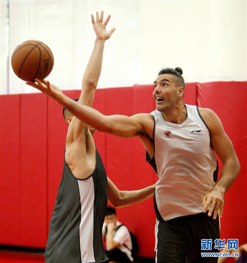 ↑10月8日,上海大鲨鱼队球员斯科拉(右)在训练中上篮。 当日,CBA上海大鲨鱼队在美国休斯敦训练,备战同休斯敦火箭队的比赛。 新华社发(宋穹摄)