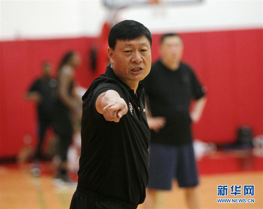 ↑10月8日,上海大鲨鱼队主教练李秋平在训练中布置战术。 当日,CBA上海大鲨鱼队在美国休斯敦训练,备战同休斯敦火箭队的比赛。 新华社发(宋穹摄)
