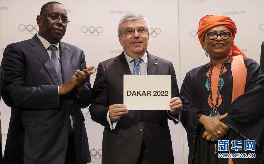 10月8日,国际奥委会主席巴赫(中)手持写有“达喀尔2022”字样的卡片与塞内加尔总统萨勒(左)、达喀尔市长苏哈姆·瓦迪尼合影。 当日,经国际奥委会第133次全会批准, 塞内加尔正式获得2022年第四届夏季青年奥运会的举办权。 新华社发