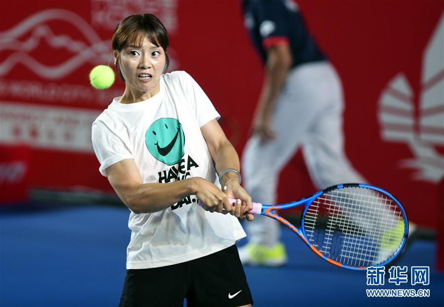 10月9日,李娜在慈善表演赛中。 当日,网坛名将李娜现身香港网球公开赛,进行了一场慈善表演赛。 新华社记者卢炳辉摄