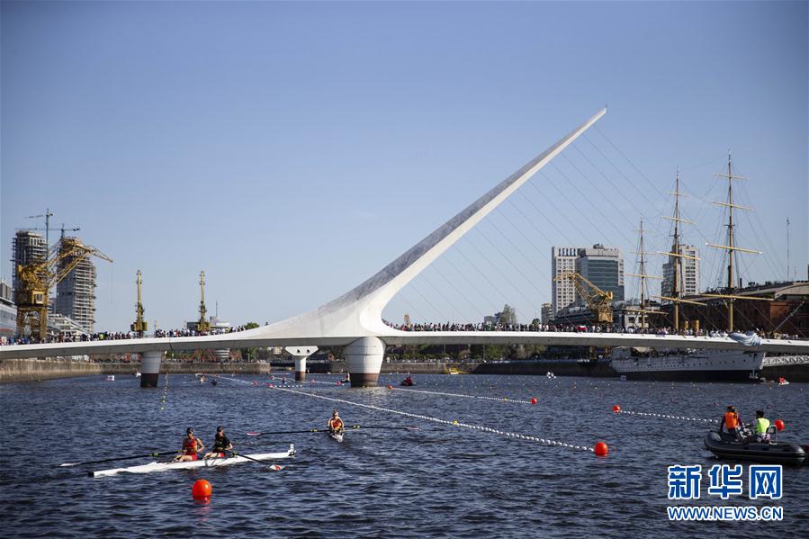 10月9日,中国选手李丹(左二)/孙红静(左一)在半决赛前热身。 当日,在阿根廷布宜诺斯艾利斯举行的第三届夏季青年奥林匹克运动会赛艇项目女子双人单桨决赛中,中国选手李丹/孙红静以1分45秒85的成绩获得第四名。 新华社记者李明摄