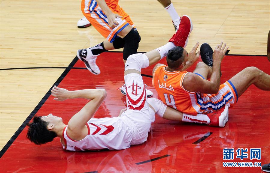 ↑10月9日,休斯敦火箭队球员周琦(左)与上海大鲨鱼队球员斯科拉在比赛中拼抢时倒地受伤。新华社发 (宋穹摄)