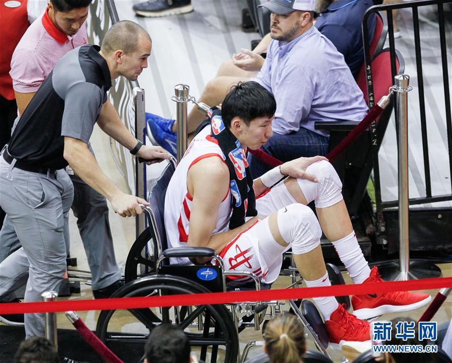 ↑10月9日,休斯敦火箭队球员周琦受伤后被工作人员用轮椅推出场外。新华社发 (宋穹摄)