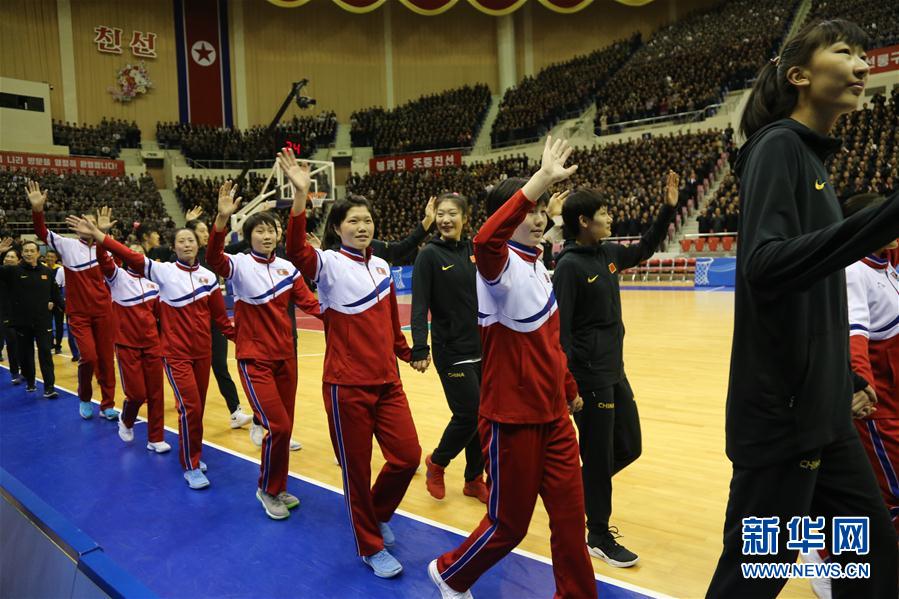 10月9日,中朝女篮队员牵手入场。 当日,一场由来访的中国女篮球员与朝鲜女篮球员参加的友谊赛在朝鲜首都平壤柳京郑周永体育馆内举行,两支由中朝球员混编而成的球队,为朝鲜观众献上了一场精彩的比赛。比赛双方分别为友谊队与团结队,每队12名球员中,中国球员与朝鲜球员各占6名。友谊队和团结队分别由中方和朝方教练组执教,比赛裁判由三名朝鲜裁判担任。最终,团结队以107比106险胜友谊队。 新华社记者程大雨摄
