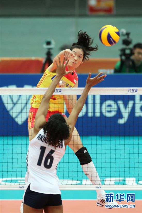 10月10日,中国队球员朱婷(上)在比赛中扣球。当日,在日本大阪举行的2018年世界女子排球锦标赛F组比赛中,中国队以3比0战胜美国队。 新华社记者杜潇逸摄