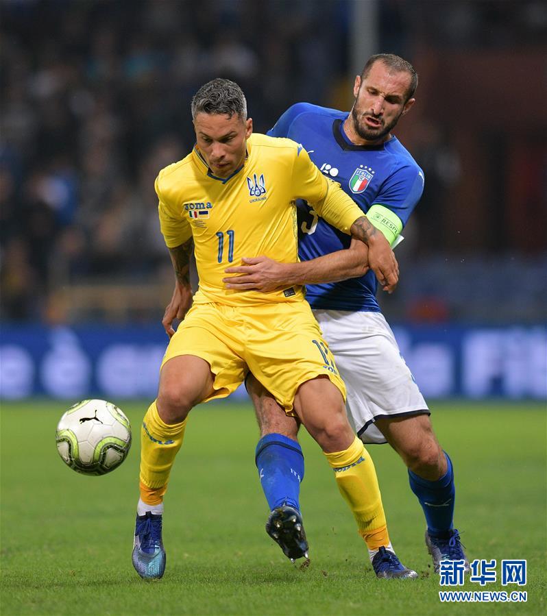 ↑10月10日,意大利队球员基耶利尼(右)在比赛中与乌克兰队球员马洛拼抢。 当日,在意大利热那亚举行的一场足球友谊赛中,意大利队以1比1战平乌克兰队。 新华社发(阿尔贝托·林格里亚摄)