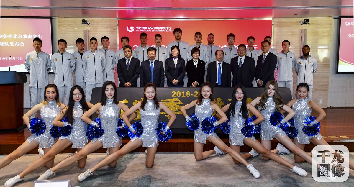 10月10日,北京农商银行篮球队在北京农商银行总部召开了2018-2019赛季新闻发布会,经过一个休赛期的调整和补充,全新的阵容也第一次正式亮相。图为与会嘉宾和球员及拉拉队合影。千龙网发 胡科摄