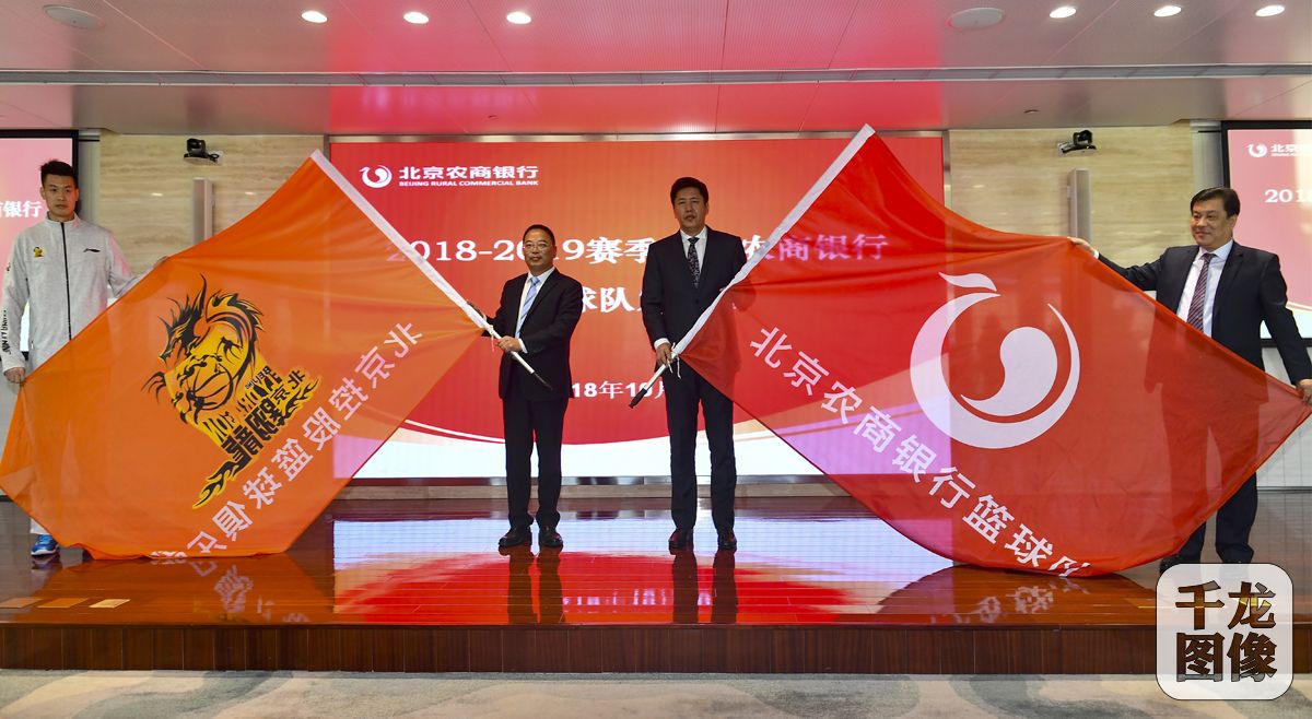 10月10日,北京农商银行篮球队在北京农商银行总部召开了2018-2019赛季新闻发布会,经过一个休赛期的调整和补充,全新的阵容也第一次正式亮相。图为北京控股集团有限公司和北京农商银行领导共同向球队授旗。千龙网发 胡科摄