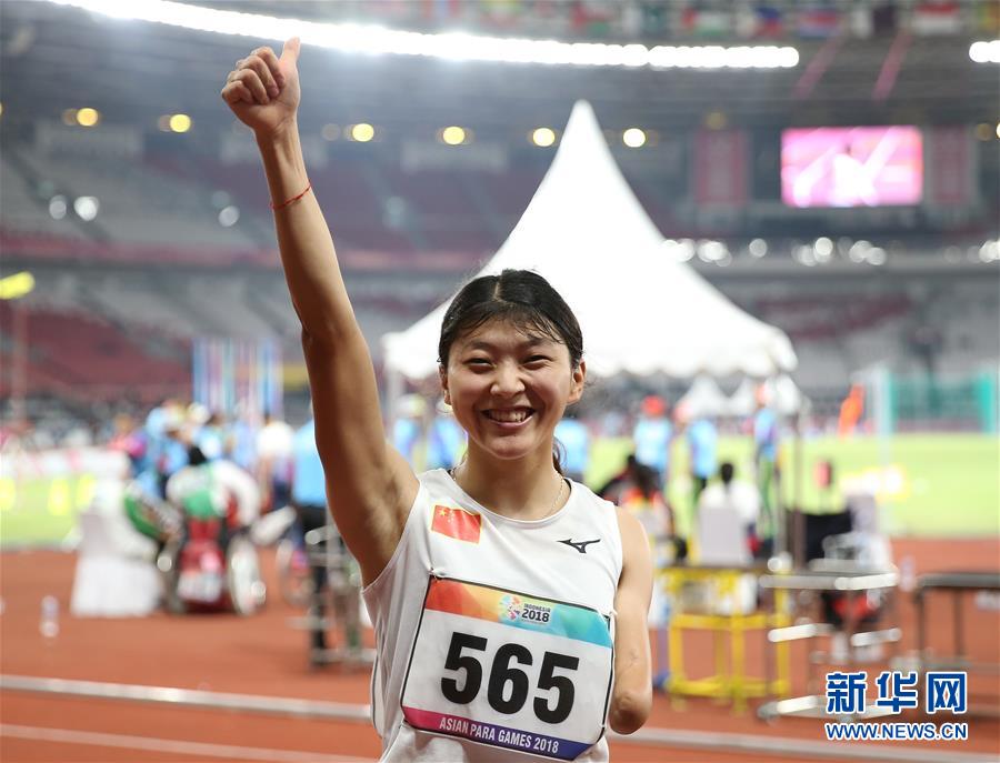 10月10日,李露在比赛后庆祝。 当日,在雅加达进行的第三届亚洲残疾人运动会田径女子100米T45/46/47级决赛中,中国选手李露以12秒57的成绩,获得冠军。 新华社记者王东震摄