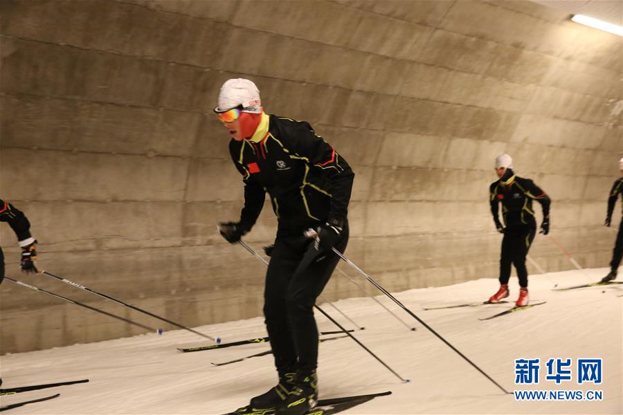 越野滑雪国家青年队的队员在滑雪隧道内训练(10月8日摄)。 日前,越野滑雪国家青年队在芬兰武奥卡蒂奥林匹克训练基地进行。武奥卡蒂建有世界第一条雪滑板隧道,地下温度保持在零下5度,可以一年四季进行雪上训练。 新华社记者李骥志摄