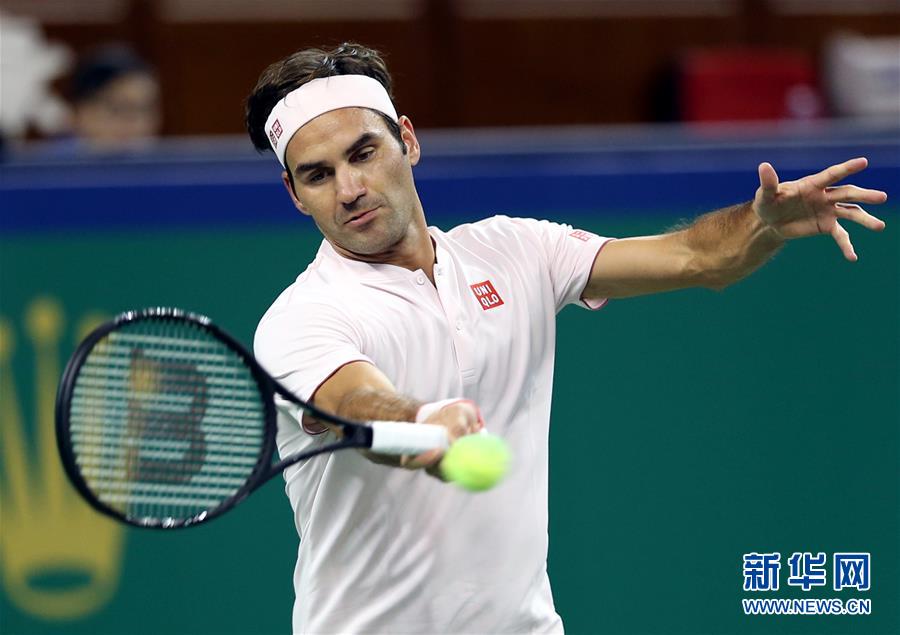 10月10日,费德勒在比赛中回球。 当日,在2018年上海大师赛男子单打第二轮比赛中,瑞士选手费德勒对阵俄罗斯选手梅德维德夫。 新华社记者凡军摄