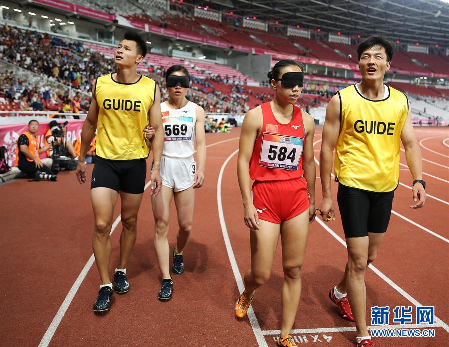 10月10日,刘翠青(左二)和引导员徐冬林(左一)、周国华(右二)和引导员贾登璞在比赛后。 当日,在雅加达进行的第三届亚洲残疾人运动会田径女子100米T11级决赛中,中国选手刘翠青和引导员徐冬林、中国选手周国华和引导员贾登璞分别以12秒07和12秒10的成绩获得冠军和亚军。 新华社记者王东震摄
