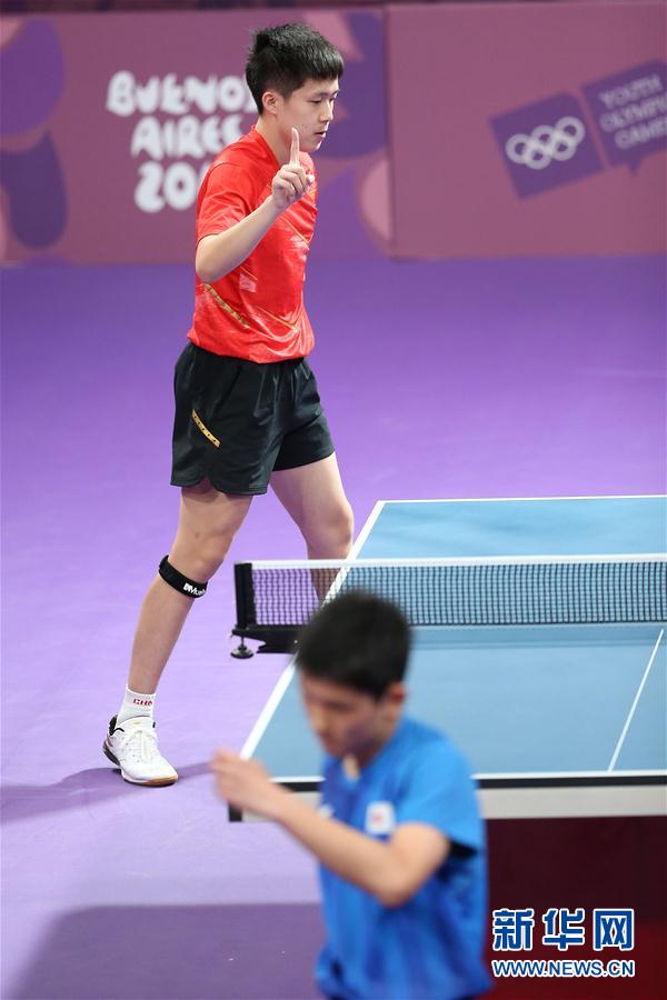 10月10日,中国选手王楚钦在比赛中。 当日,在阿根廷布宜诺斯艾利斯举行的第三届夏季青年奥林匹克运动会乒乓球男子单打决赛中,中国选手王楚钦以4比1战胜日本选手张本智和,获得冠军。 新华社记者李俊东摄