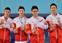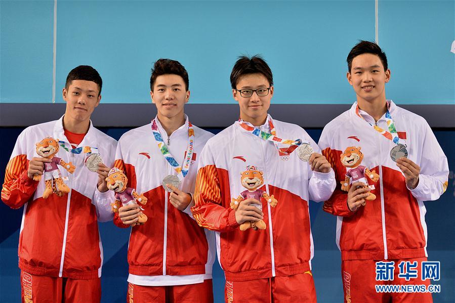10月10日,中国队选王冠斌、孙佳俊、沈加豪、洪金权(从左至右)在颁奖仪式上。 当日,在阿根廷布宜诺斯艾利斯举行的第三届夏季青年奥林匹克运动会男子4X100米混合泳接力决赛中,中国队以3分38秒65的成绩获得亚军。 新华社记者贺长山摄