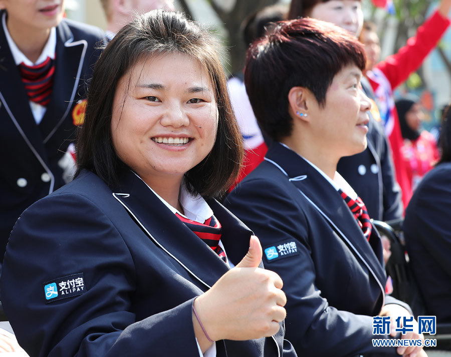 10月4日,中国体育代表团成员董飞霞(左)身着支付宝赞助的开幕式礼服准备参加升旗仪式。 当日,第三届亚洲残疾人运动会中国体育代表团在印度尼西亚雅加达运动员村举行升旗仪式。 新华社记者王东震摄