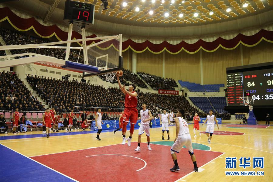 ↑10月11日,友谊队中国球员王哲林(左上)在比赛中上篮。新华社记者程大雨摄