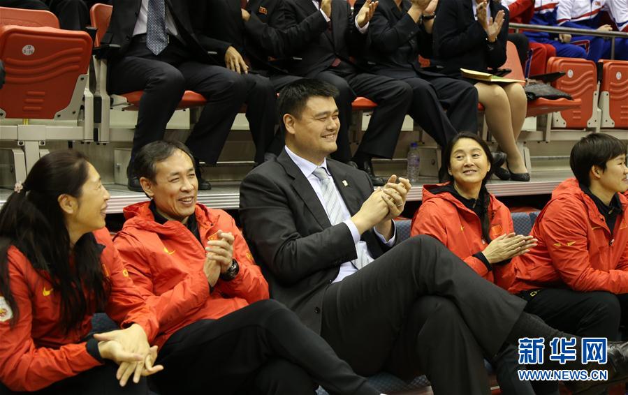↑10月11日,中国篮协主席姚明(左三)在场边观赛。新华社记者程大雨摄