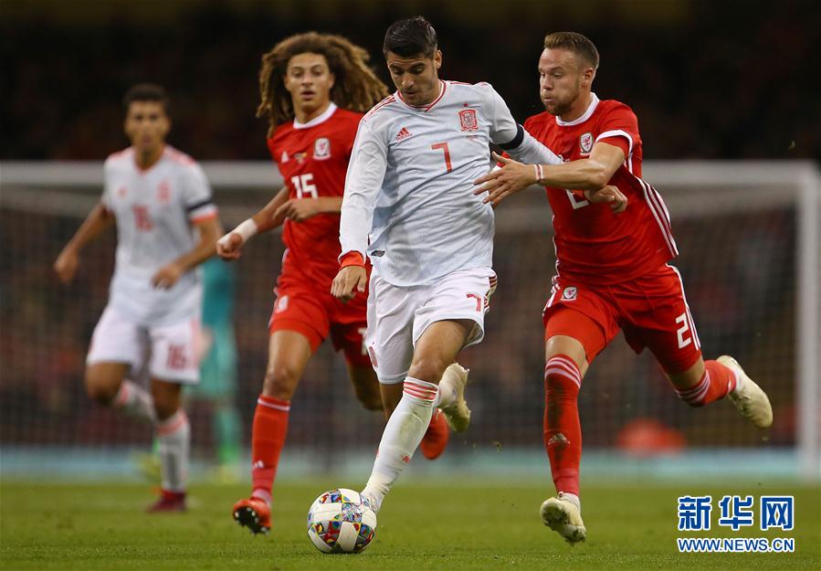 10月11日,西班牙队球员莫拉塔(中)在比赛中突破。当日,在威尔士卡迪夫举行的一场国际足球友谊赛中,西班牙队客场以4比1战胜威尔士队。新华社/法新