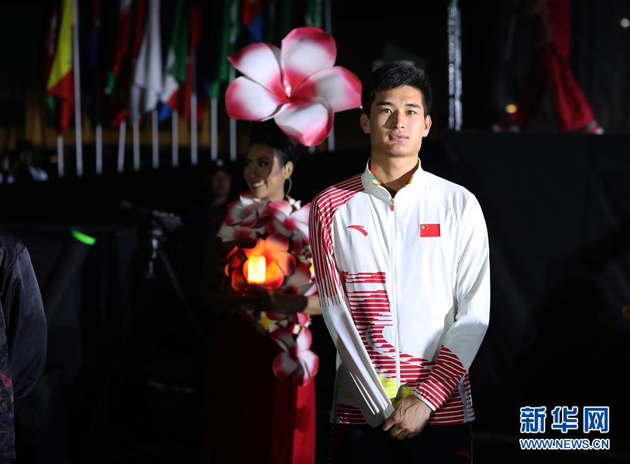 10月13日,中国代表团旗手王浩在闭幕式上。 新华社记者王东震摄