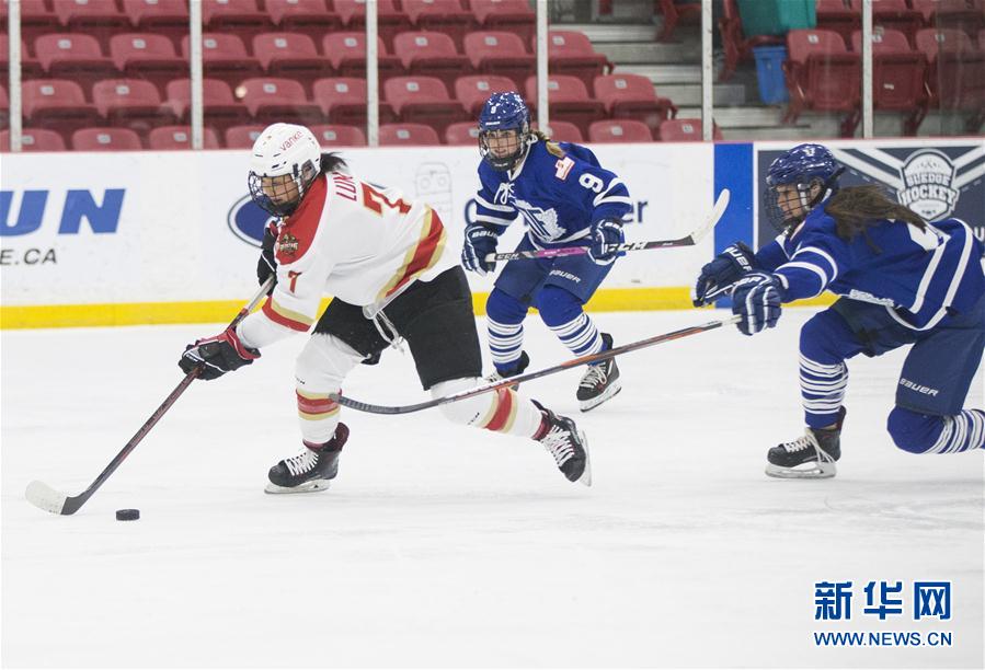 10月14日,深圳昆仑鸿星万科阳光队球员林绮琪(左)在比赛中进攻。 当日,在2018-2019赛季加拿大女子冰球联赛中,深圳昆仑鸿星万科阳光队客场以3比0战胜多伦多狂暴队,取得两连胜。 新华社记者邹峥摄