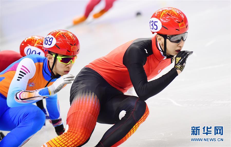 10月14日,吉林省体育局冰上运动管理中心选手武大靖(右)在比赛中。 当日,在吉林长春举行的2018中国杯短道速滑精英联赛第一站男子1000米决赛中,吉林省体育局冰上运动管理中心选手武大靖以1分40秒481的成绩夺得冠军。 新华社记者林宏摄