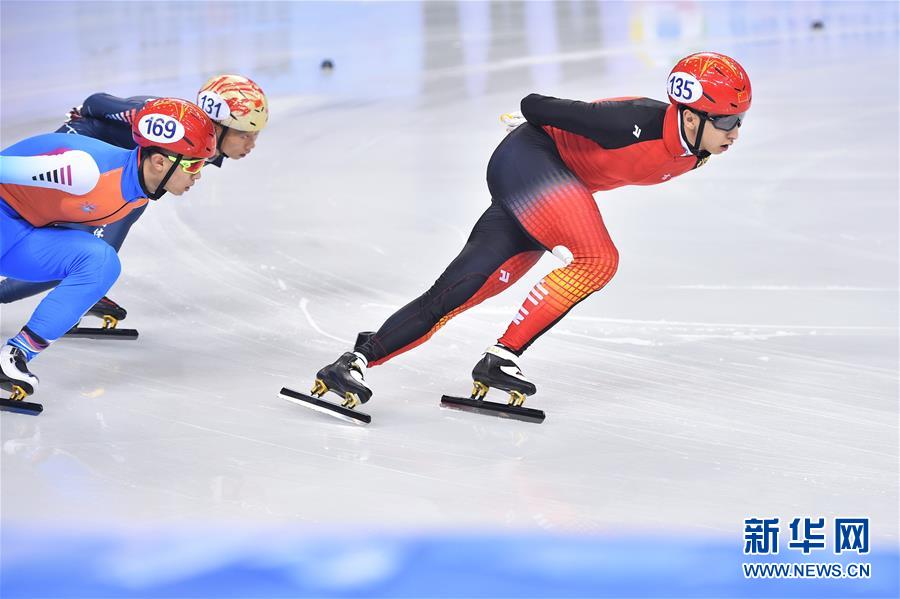 10月14日,吉林省体育局冰上运动管理中心选手武大靖(右)在比赛中。 当日,在吉林长春举行的2018中国杯短道速滑精英联赛第一站男子1000米决赛中,吉林省体育局冰上运动管理中心选手武大靖以1分40秒481的成绩夺得冠军。 新华社记者孙玮彤摄