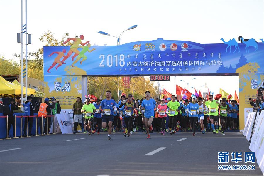10月14日,参赛选手在比赛中起跑。 当日,2018内蒙古额济纳穿越胡杨林国际马拉松赛在内蒙古自治区额济纳旗开赛。本次比赛设置了全程马拉松、半程马拉松及欢乐跑三项赛事,共吸引国内外2000余名选手参赛。 新华社记者邹予摄