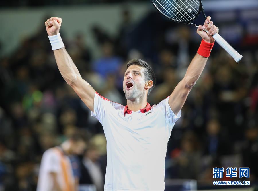10月14日,焦科维奇在赛后庆祝夺冠。 当日,在2018年上海大师赛男子单打决赛中,塞尔维亚选手焦科维奇以2比0战胜克罗地亚选手丘里奇,夺得冠军。 新华社记者丁汀摄