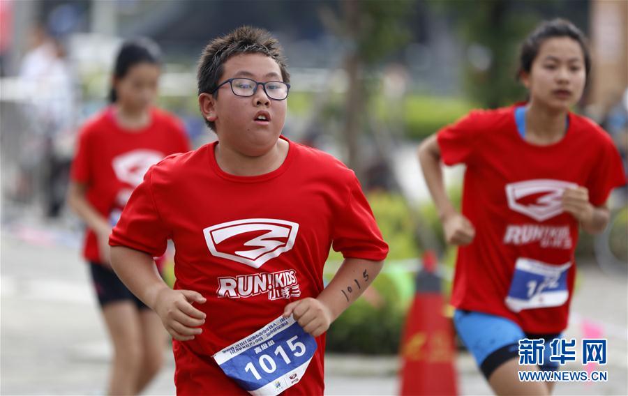 10月14日,参赛选手在跑步项目比赛中。 当日,2018深圳市青少年铁人三项赛在深圳市松岗体育中心举行。赛事分设8.2公里高级组、4.3公里初级组和1.45公里兴趣组三个组别,吸引了近400名选手参加。 新华社记者黄国保摄