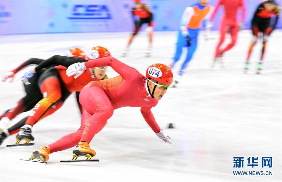 10月14日,哈尔滨市冬季运动项目训练中心队选手任子威(右)在比赛中。 当日,在吉林长春举行的2018中国杯短道速滑精英联赛第一站男子5000米接力决赛中,哈尔滨市冬季运动项目训练中心代表队以7分19秒999的成绩夺得冠军。 新华社记者林宏摄