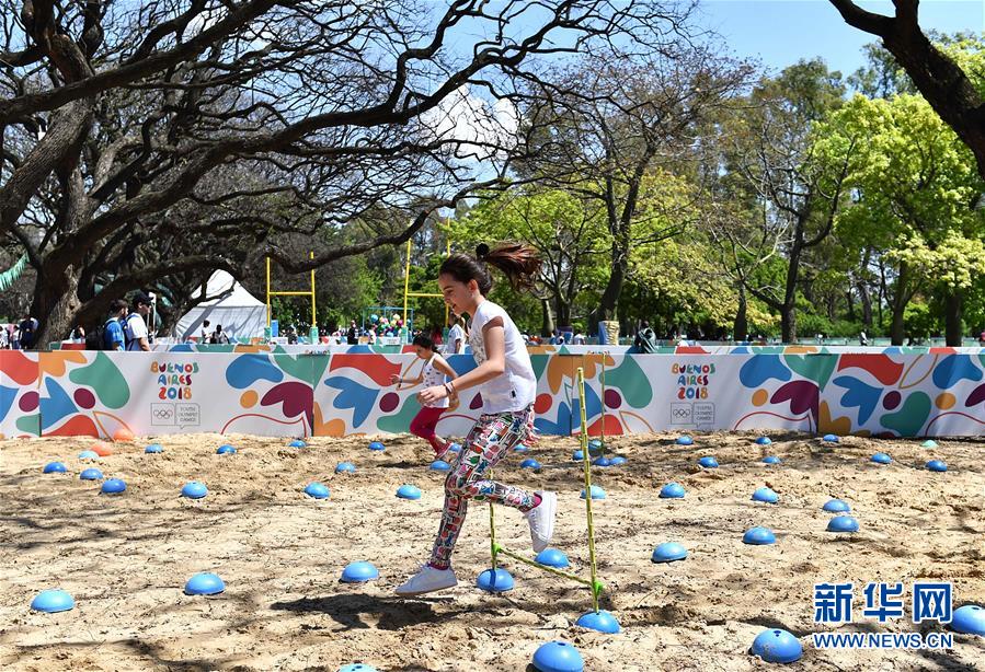 10月13日,小朋友在绿荫公园赛区体验铁人三项运动。 正在阿根廷首都布宜诺斯艾利斯举行的第三届夏季青年奥林匹克运动会受到当地市民的关注,他们利用周末假期,纷纷来到青奥会各个赛区观看比赛,并积极参与体验赛场外的各种趣味体育运动,感受青奥会,快乐度周末。 新华社记者贺长山摄