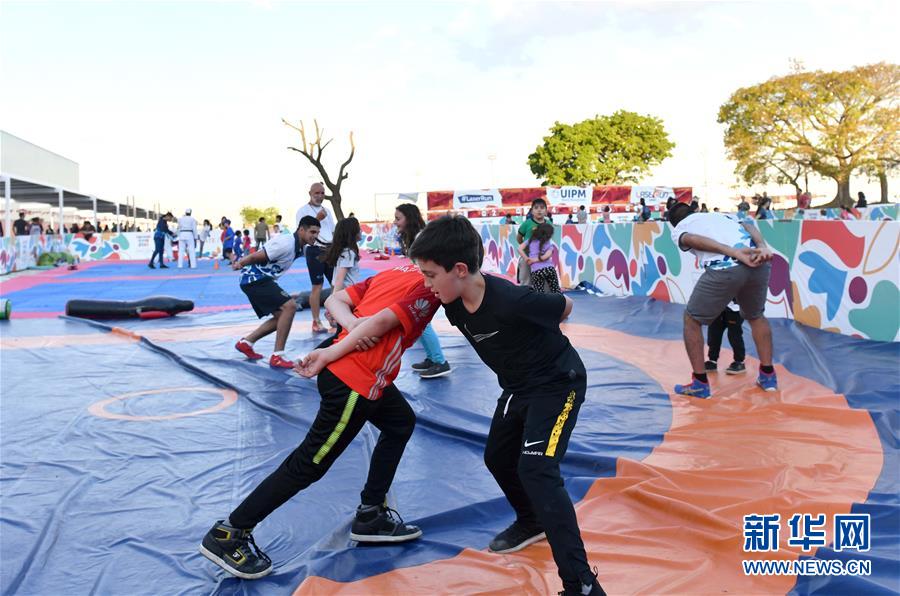 10月13日,几名少年在青年奥林匹克公园内体验摔跤运动。 新华社记者李俊东摄