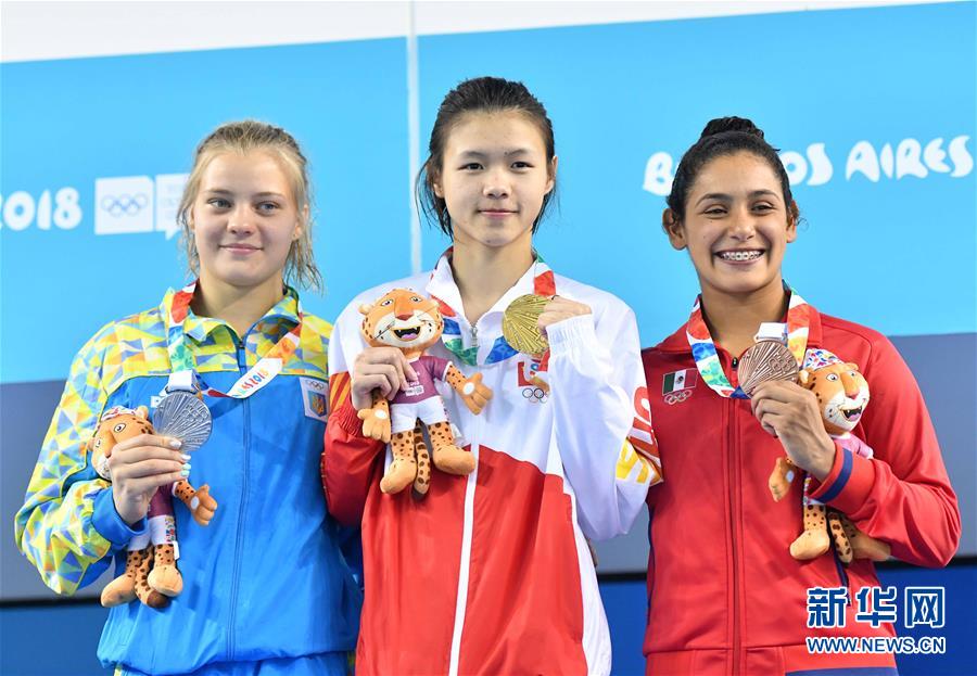 10月13日,获得冠军的中国选手林珊(中)、获得亚军的乌克兰选手索菲娅(左)和获得季军的墨西哥选手加西亚在颁奖仪式上。 当日,在阿根廷布宜诺斯艾利斯举行的第三届夏季青年奥林匹克运动会跳水项目比赛中,中国选手林珊以466.50分的总成绩获得女子10米跳台冠军。 新华社记者朱峥摄