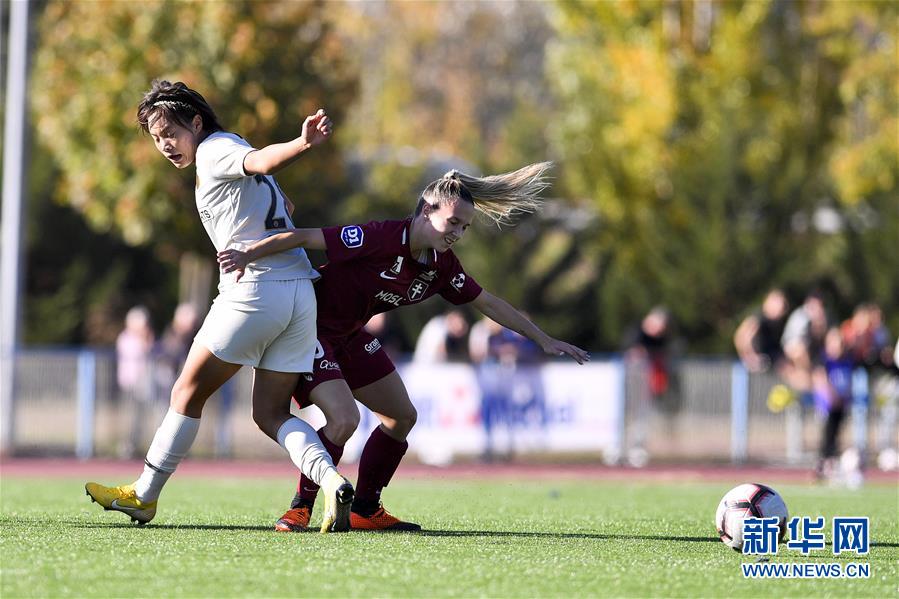 10月13日,巴黎圣日耳曼队球员王霜(左)与梅斯队球员加沃里在比赛中争球。 当日,在2018-2019赛季法国足球甲级女子联赛第六轮比赛中,巴黎圣日耳曼队客场以3比1战胜梅斯队。 新华社记者陈益宸摄