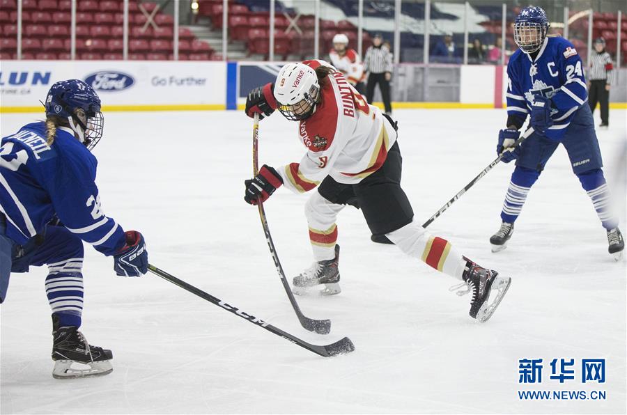 10月13日,深圳昆仑鸿星万科阳光队球员汉娜·邦顿(中)在比赛中射门。 当日,在2018-2019赛季加拿大女子冰球联赛中,深圳昆仑鸿星万科阳光队客场以5比1战胜多伦多狂暴队,赢得新赛季首场比赛胜利。 新华社发(邹峥摄)