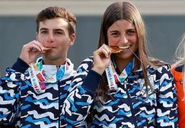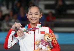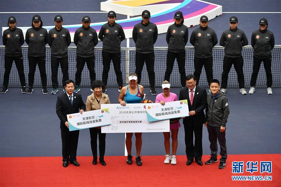 10月14日,梅里查尔(前左三)和佩斯克(前右三)在颁奖仪式上。 当日,在2018年WTA天津公开赛双打决赛中,梅里查尔(美国)/佩斯克(捷克)以2比0战胜澳大利亚组合亚当恰克/摩尔,获得冠军。 新华社记者李然摄
