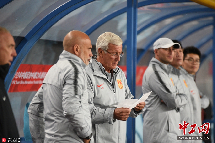 10月15日,江苏南京,2018中国之队国际足球友谊赛前瞻,中国队赛前冒雨踩场训练。10月16日晚,他们将在南京奥体中心体育场迎战叙利亚国家男子足球队。里皮 图片来源:东方IC