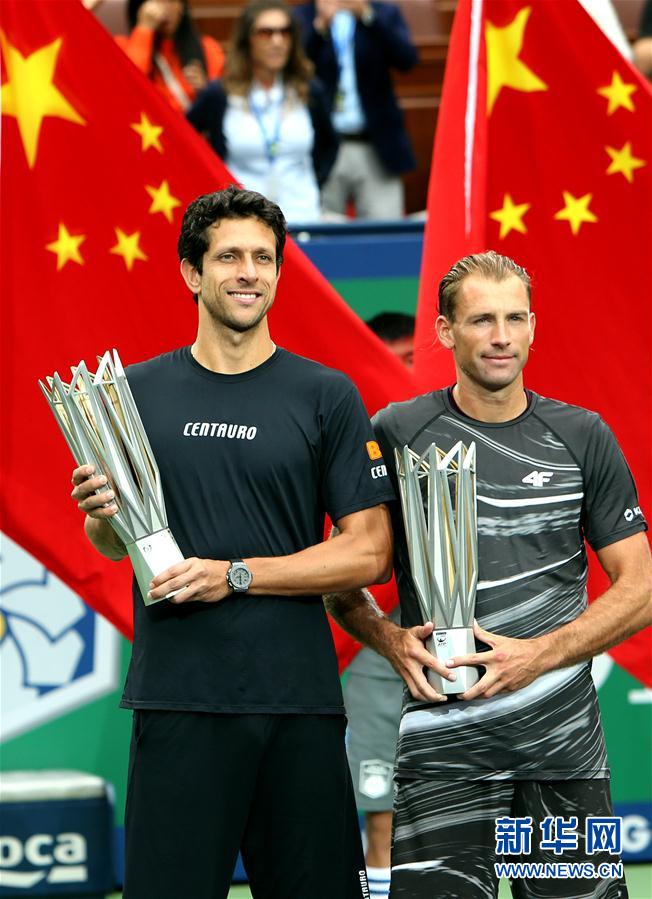 10月14日,库伯特(右)和梅洛在颁奖仪式上。 当日,在2018年ATP上海大师赛双打决赛中,库伯特(波兰)/梅洛(巴西)以2比0战胜杰米·默里(英国)/苏亚雷斯(巴西),夺得冠军。 新华社记者凡军摄