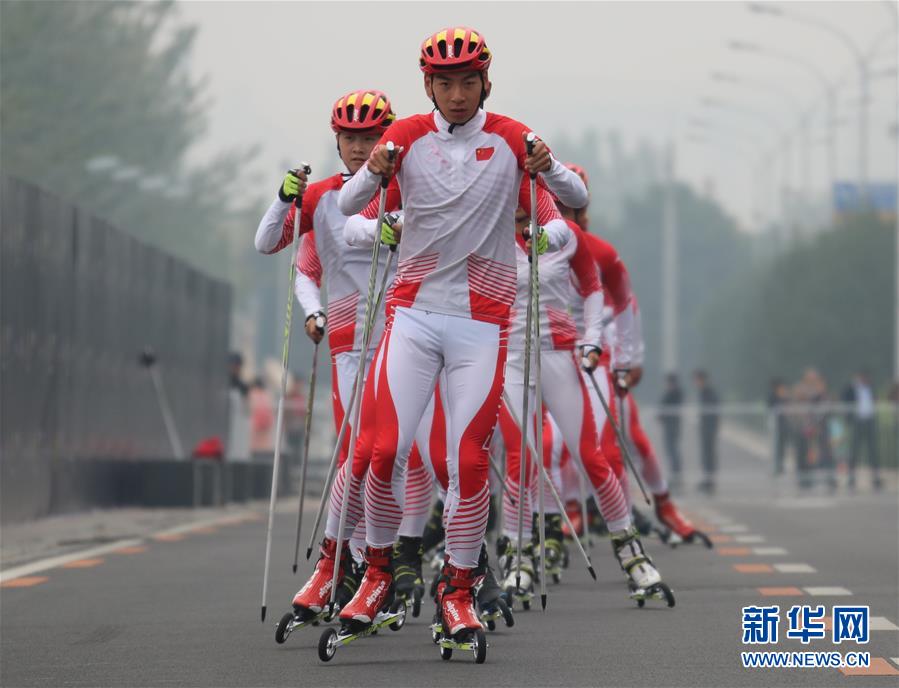 10月15日,中国越野滑雪国家集训队运动员在活动前热身。 当日,“2018年中国—挪威友好滑轮活动”在北京奥林匹克公园举行。由中国越野滑雪国家集训队运动员和挪威越野滑雪明星组成的中挪混合编队带来了一场滑轮表演。 新华社发(雒圆摄)