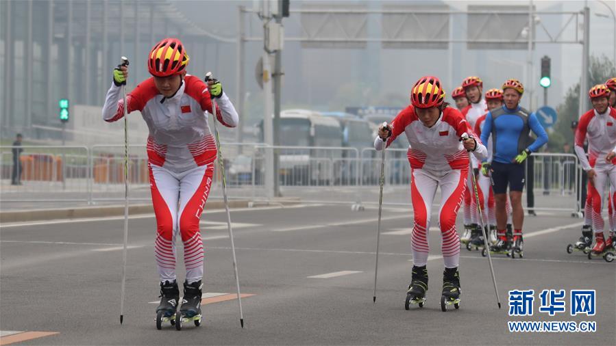 10月15日,中挪混合编队进行表演。 当日,“2018年中国—挪威友好滑轮活动”在北京奥林匹克公园举行。由中国越野滑雪国家集训队运动员和挪威越野滑雪明星组成的中挪混合编队带来了一场滑轮表演。 新华社发(雒圆摄)