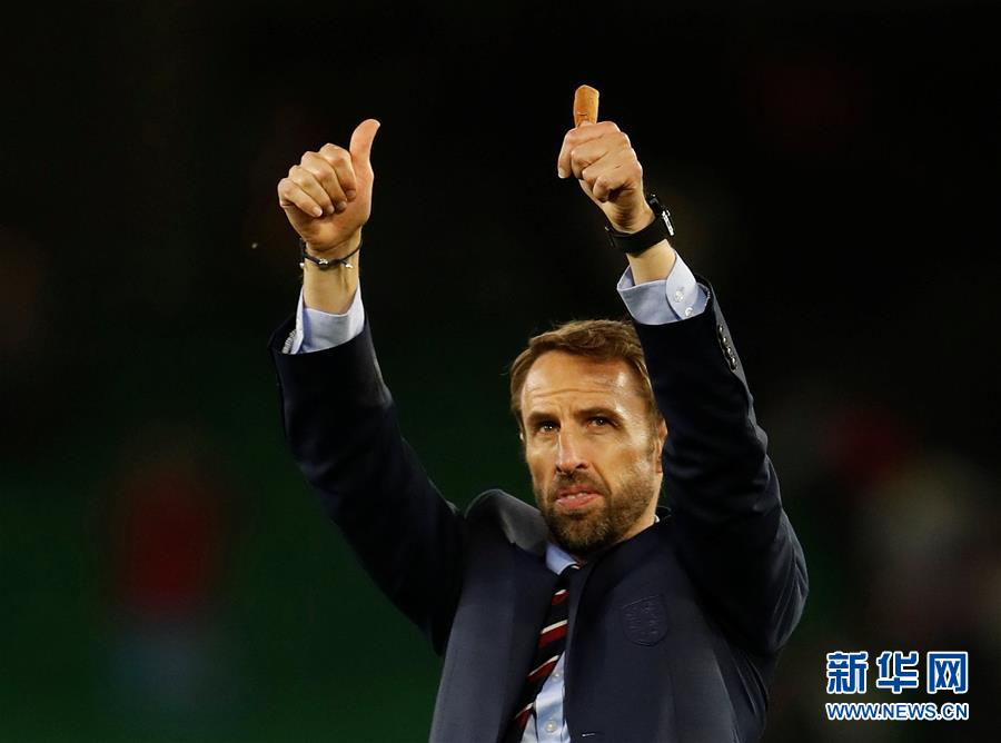 10月15日,英格兰队主教练索斯盖特在比赛后向球迷致意。 当日,在西班牙塞维利亚进行的欧洲国家联赛A级第4组的比赛中,英格兰队客场以3比2战胜西班牙队。 新华社/路透