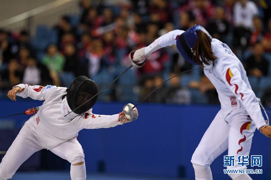 10月15日,林声(左)与许诚子在比赛中。 当日,在安徽合肥举行的2018年全国击剑锦标赛女子重剑个人赛决赛中,福建队选手林声以15比6战胜江苏队选手许诚子,获得冠军。 新华社记者张端摄