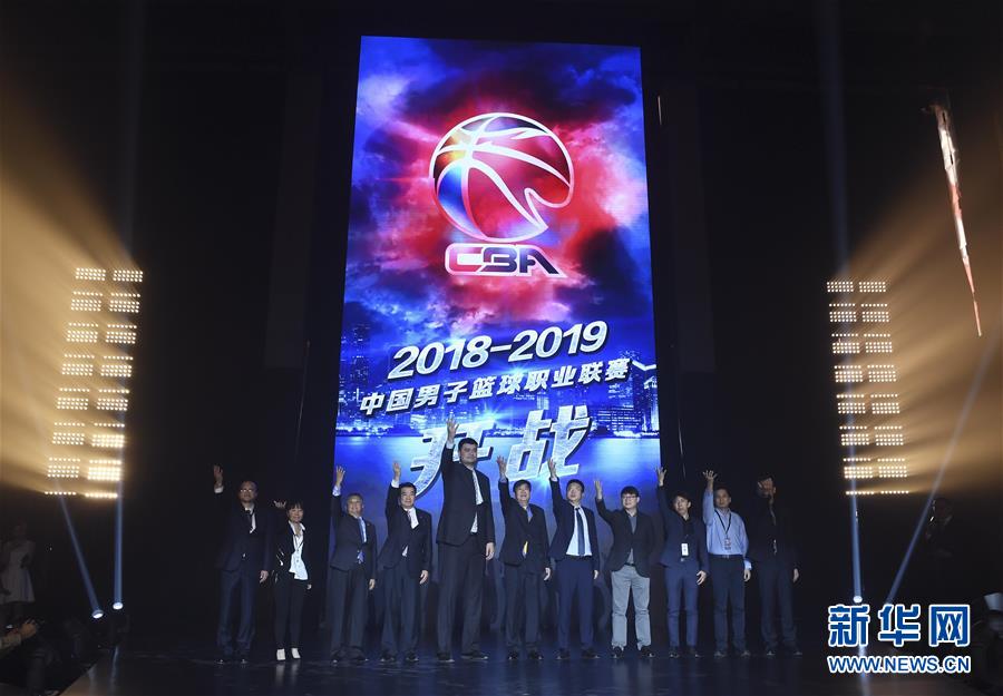 10月18日,姚明(中)与嘉宾一起用托举篮球的姿势启动新赛季。新华社记者陶希夷摄