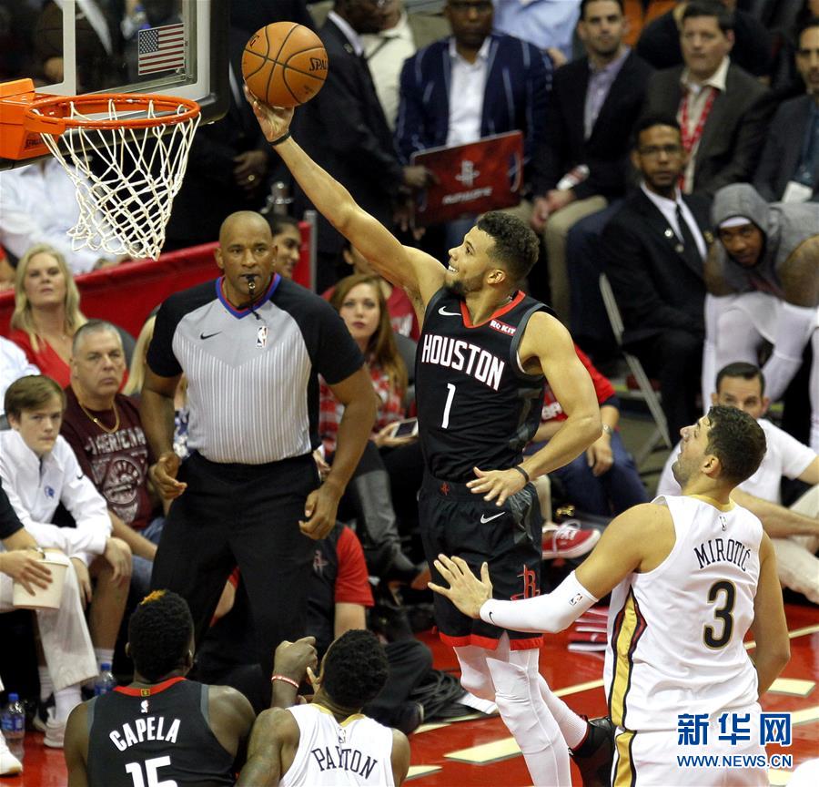 10月17日,火箭队球员迈卡威(上)在比赛中突破上篮。 当日,在2018-2019赛季NBA常规赛中,休斯敦火箭队主场以112比131不敌新奥尔良鹈鹕队。 新华社发(宋穹摄)
