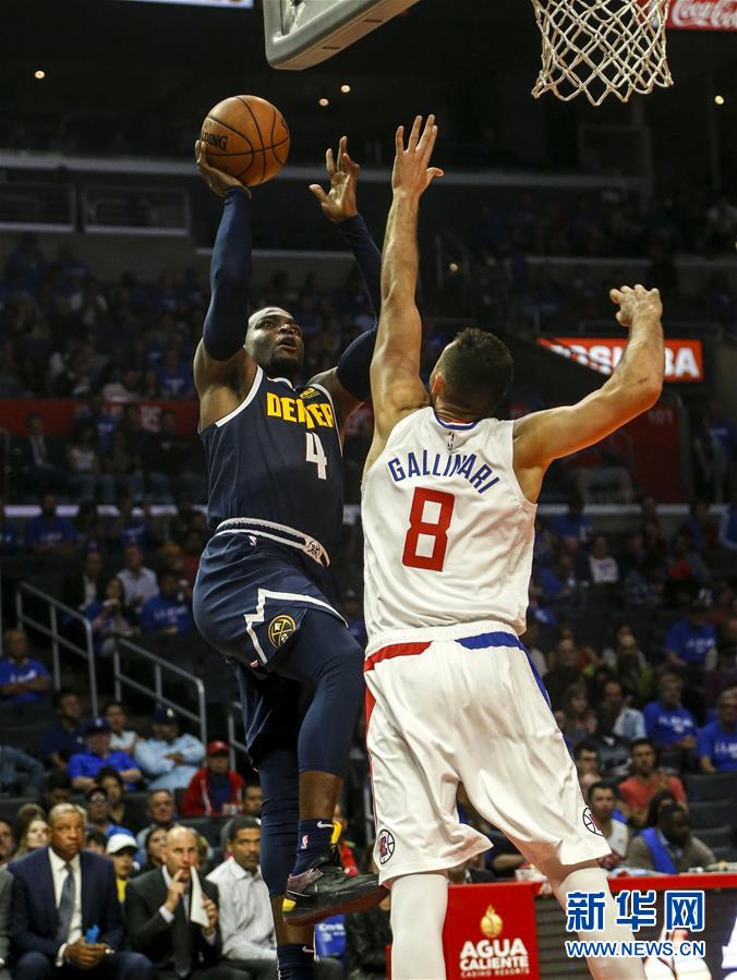 10月17日,掘金队球员米尔萨普(左)在比赛中投篮。 当日,在2018-2019赛季NBA常规赛中,洛杉矶快船队主场以98比107不敌丹佛掘金队。 新华社发(赵汉荣摄)